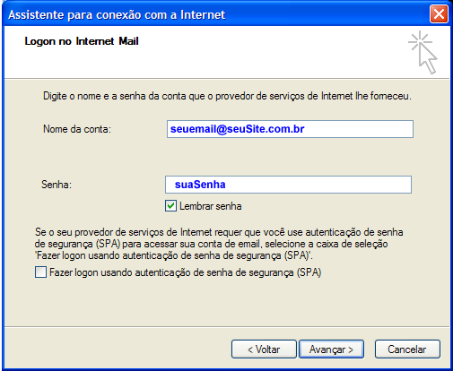 6- Em nome da conta coloque seuEmail@seuSite.com.br e em senha coloque a sua e avance,