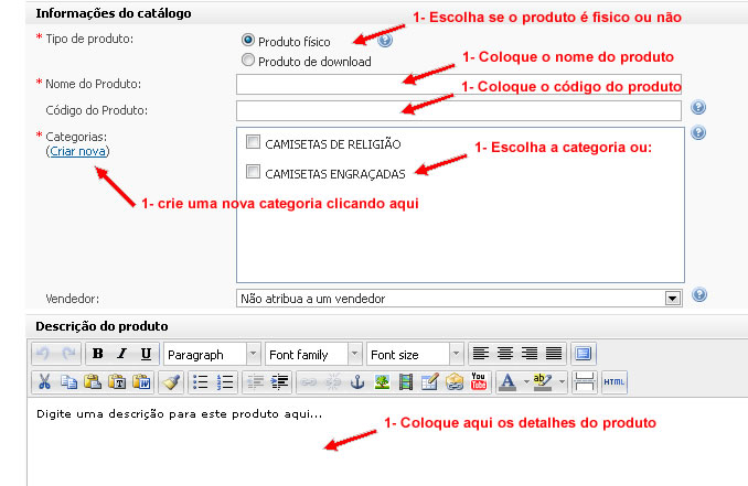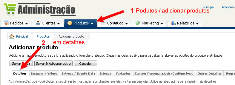 APÓS TER LOGADO NA ÁREA ADMINISTRATIVA DA LOJA CLIQUE EM: PRODUTOS / ADICIONAR PRODUTOS,